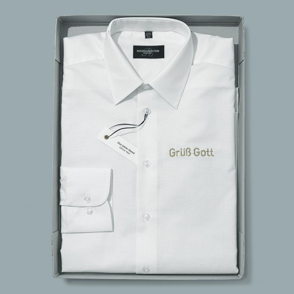 Ottmar HörlDas Letzte Hemd 2013Weisses Herrenhemd, gold/schwarz bestickt „Grüß Gott!“ Box 45 x 33 x 5 cm 1/35–35/35, sign./num. 250,00 €(inkl. MwSt. zzgl. Versandkosten)Bestellung