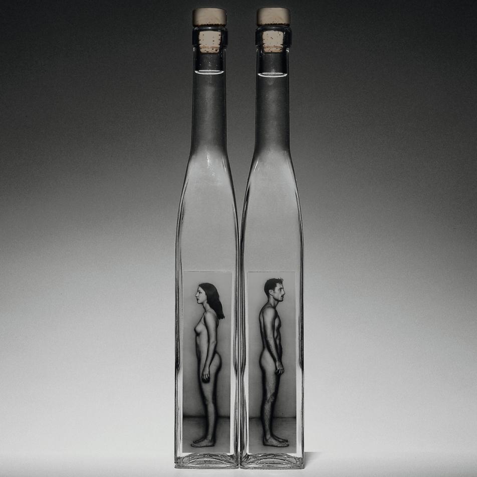 2 Aktfotos als Schwarz-Weiß-Handabzüge auf Sibergelatine-Barytpapier, aufgezogen jeweils auf die Fläche einer quadratischen Grappa-Flasche. Inhalt: je 0,5 Liter Grappa di Cartizze (Motiv „Adam“) und Grappa di Sauvignon (Motiv „Adam“) aus Treviso in Geschenkboxen aus Holz mit Plexiglasschuber und Editionsfibel. Limitiert auf 125 Exemplare pro Paar, nummeriert und handsigniert.