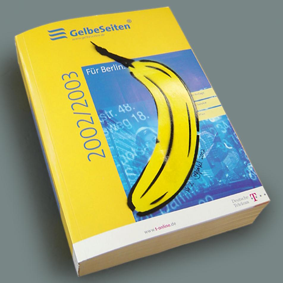 Seit 1986 markiert Thomas Baumgärtel unter dem Pseudonym „Bananensprayer" Kunstorte in Europa und Amerika. Um die weißen Flecken, die noch auf der deutschen Landkarte bestehen, zu überbrücken, hat er im Jahr 2002 die Einbände der 118 Regionalausgaben des amtlichen Branchentelefonbuches mit seiner „Kunst-Banane" besprüht.