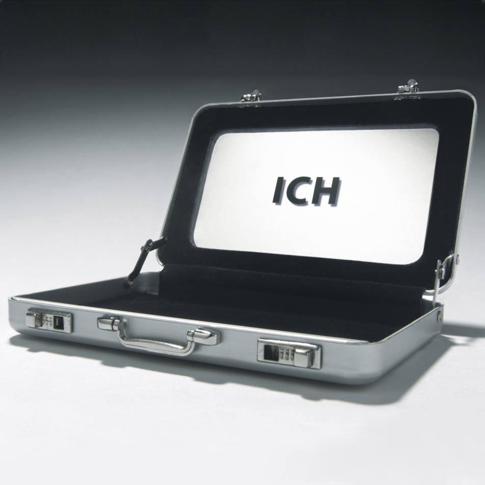 „Io, Michelangelo Buonarroti“ – mit dem Erwachen des persönlichen Selbstverständnisses der bildenden Künstler in der Renaissance tragen ihre Werke eine Art Ich-Stempel. Kunst wird mit dem Selbstsein verknüpft, insbesondere in selbstbewussten Selbstporträts, später – ab Anfang der 1960er Jahre – mit der Zurschaustellung der eigenen Person identifiziert oder auf „Ich“-Schriftbilder reduziert. Mit dem ICH-Taschenspiegel hat Ottmar Hörl diese Ich-Identifizierung sprachlich und formal verdichtet in Form des nostalgischen Taschenspiegels und in der Variation des Visitenkarten- und Kreditkartenetuis als Kofferminiatur aus Aluminium mit Schnappschlössern.
