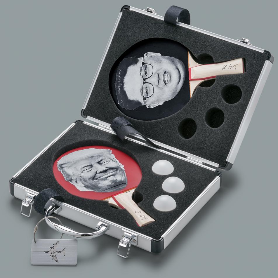 Ottmar Hörl spielt auf den Schlagabtausch zwischen zwei unberechenbaren Präsidenten an – mit Ping-Pong-Schlägern, die den Kontrahenten ähnlich sehen.