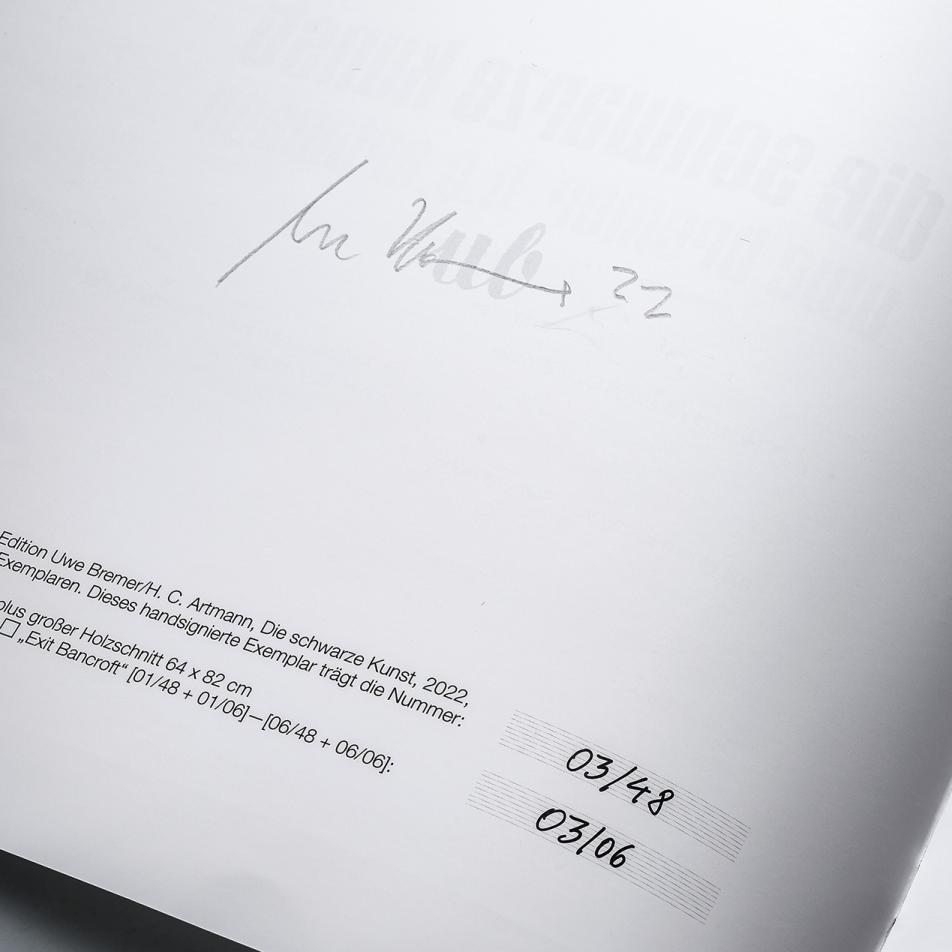 1978 schreibt H. C. Artmann „sieben Mitteilungen zur schwarzen Kunst“ von Uwe Bremer. Damals erschienen in einer auf 90 Exemplare limitierten, von der Hamburger Galerie Brockstedt herausgegebenen Grafikmappe mit sieben Farbradierungen ist dieser Text des österreichischen Schriftstellers bis heute weithin unbekannt. 2021, im Jahr von Artmanns hundertsten Geburtstag, würdigt Bremer seinen im Jahr 2000 verstorbenen Freund mit einem neuen Portrait und interpretiert dessen Text aus 1978 in sieben neuen Holzschnitten – versammelt in einer „Zauberbox“ mit textzitierenden Utensilien.